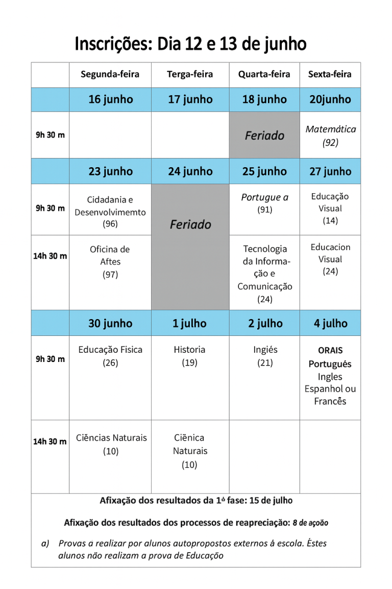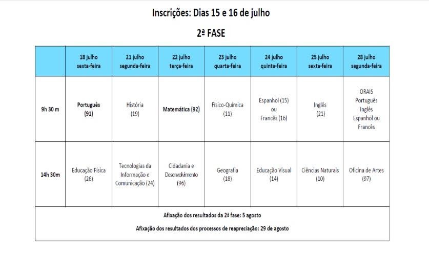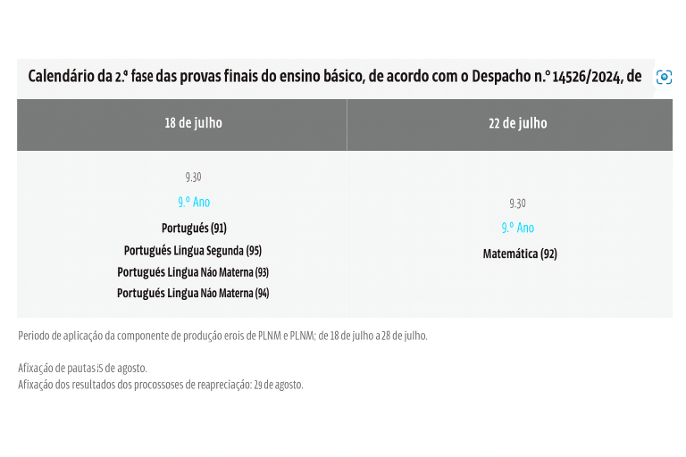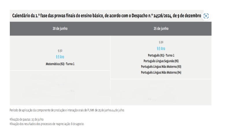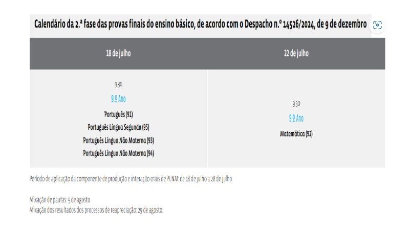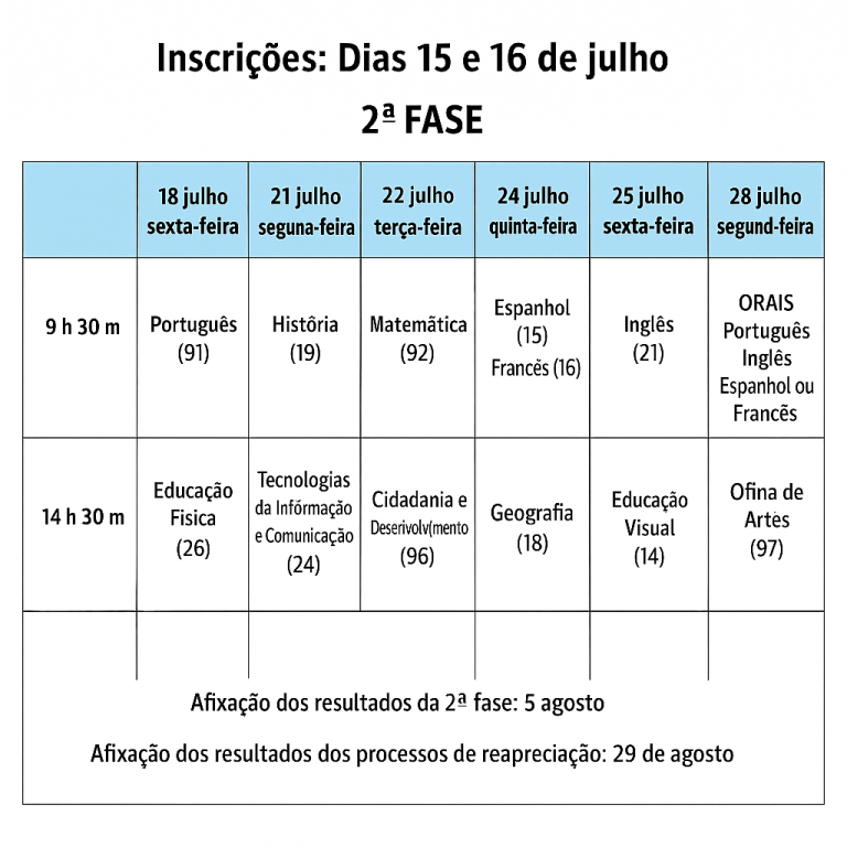 Nos quadros disponibilizados é possível consultar, de forma imediata, as datas, horários e disciplinas de cada prova, bem como as datas de divulgação de pautas e resultados de reapreciação. Estes recursos foram reorganizados para garantir maior legibilidade e podem ser descarregados ou visualizados individualmente.